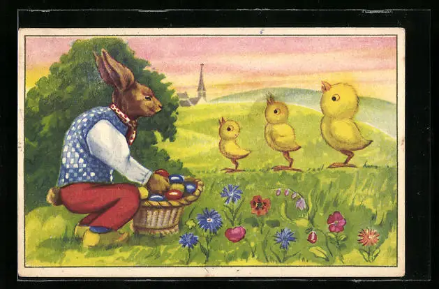 AK Osterhase mit Korb voller Ostereiern, Osterküken