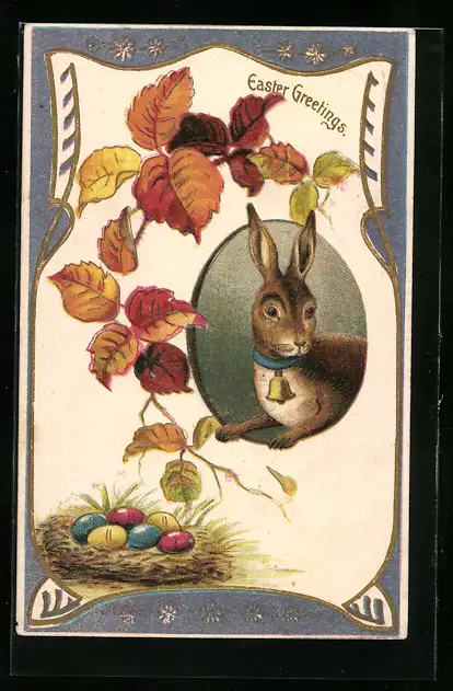 AK Osterhase mit Laub und Eiern