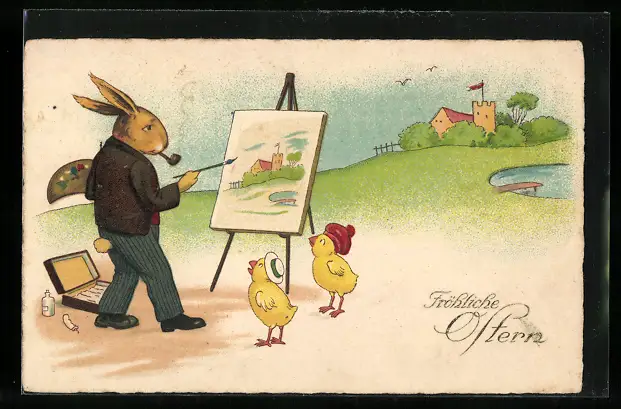 AK Osterhase mit Osterküken an der Staffelei
