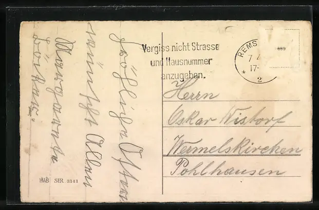 Personenbezogene Daten auf der Rückseite der Karte wurden durch blauen Textmarker unkenntlich gemacht. Die blauen Stellen sind auf die Vorderseite durchgeweicht und wirken sich negativ auf das Postkartenfoto aus