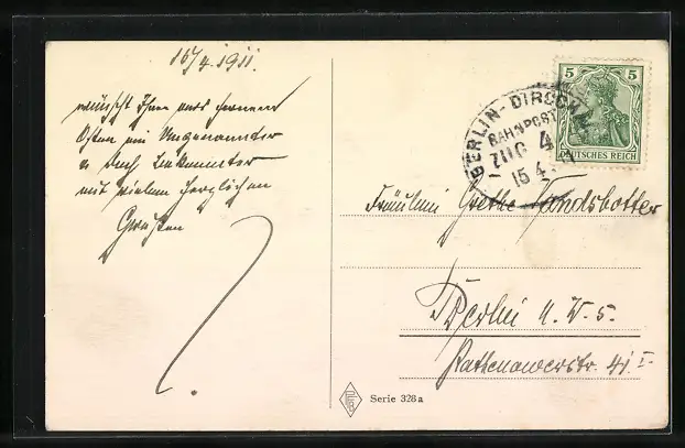 Personenbezogene Daten auf der Rückseite der Karte wurden durch blauen Textmarker unkenntlich gemacht. Die blauen Stellen sind auf die Vorderseite durchgeweicht und wirken sich negativ auf das Postkartenfoto aus
