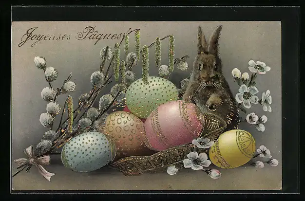 AK Osterhase mit bunten Eiern, Weidenzweigen und Apfelblüten