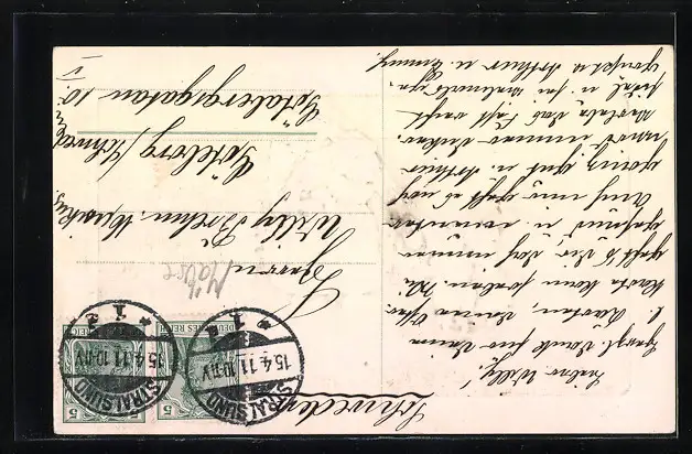 Personenbezogene Daten auf der Rückseite der Karte wurden durch blauen Textmarker unkenntlich gemacht. Die blauen Stellen sind auf die Vorderseite durchgeweicht und wirken sich negativ auf das Postkartenfoto aus