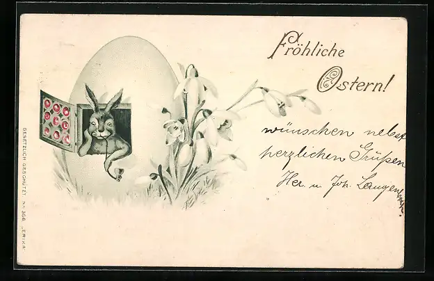AK Osterhase schaut mit Pfeife aus einem Fenster im Osterei