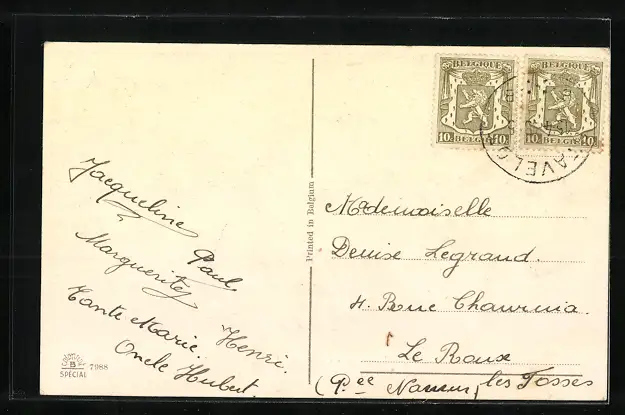 Personenbezogene Daten auf der Rückseite der Karte wurden durch blauen Textmarker unkenntlich gemacht. Die blauen Stellen sind auf die Vorderseite durchgeweicht und wirken sich negativ auf das Postkartenfoto aus