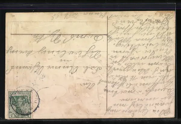 Personenbezogene Daten auf der Rückseite der Karte wurden durch blauen Textmarker unkenntlich gemacht. Die blauen Stellen sind auf die Vorderseite durchgeweicht und wirken sich negativ auf das Postkartenfoto aus