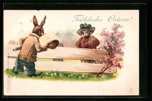 AK Osterhasen-Herr grüsst Dame am Zaun
