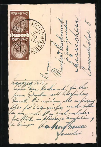 Personenbezogene Daten auf der Rückseite der Karte wurden durch blauen Textmarker unkenntlich gemacht. Die blauen Stellen sind auf die Vorderseite durchgeweicht und wirken sich negativ auf das Postkartenfoto aus