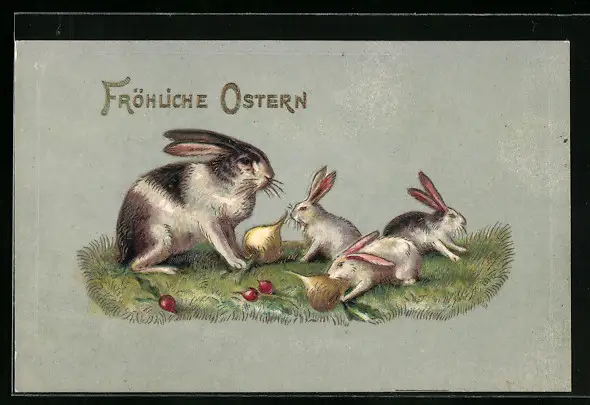 AK Osterhasen auf der Wiese, Fröhliche Ostern