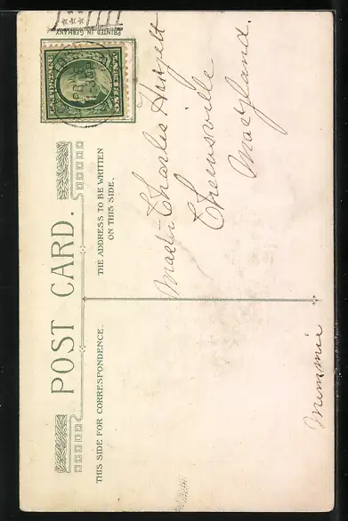 Personenbezogene Daten auf der Rückseite der Karte wurden durch blauen Textmarker unkenntlich gemacht. Die blauen Stellen sind auf die Vorderseite durchgeweicht und wirken sich negativ auf das Postkartenfoto aus