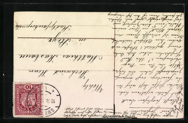 Personenbezogene Daten auf der Rückseite der Karte wurden durch blauen Textmarker unkenntlich gemacht. Die blauen Stellen sind auf die Vorderseite durchgeweicht und wirken sich negativ auf das Postkartenfoto aus
