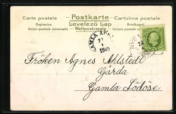 Personenbezogene Daten auf der Rückseite der Karte wurden durch blauen Textmarker unkenntlich gemacht. Die blauen Stellen sind auf die Vorderseite durchgeweicht und wirken sich negativ auf das Postkartenfoto aus