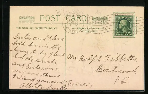 Personenbezogene Daten auf der Rückseite der Karte wurden durch blauen Textmarker unkenntlich gemacht. Die blauen Stellen sind auf die Vorderseite durchgeweicht und wirken sich negativ auf das Postkartenfoto aus