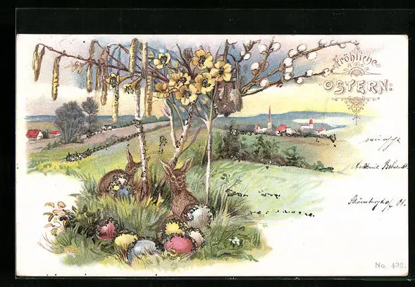 AK Osterhasen mit Ostereiern im Grünen