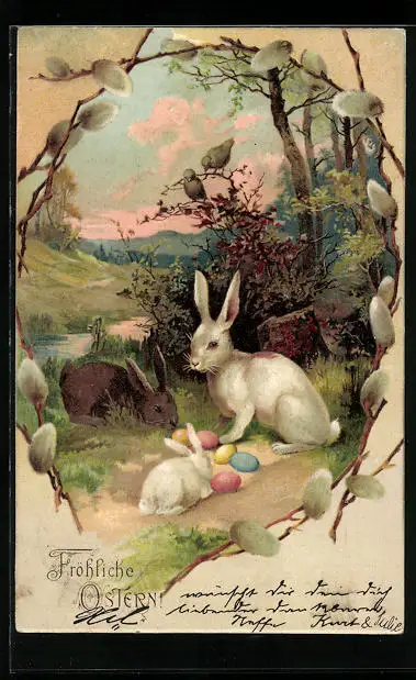 AK Osterhasen mit Ostereiern und Palmzweigen