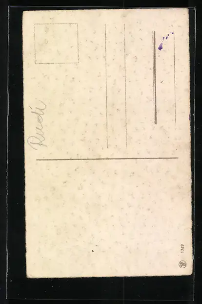 Personenbezogene Daten auf der Rückseite der Karte wurden durch blauen Textmarker unkenntlich gemacht. Die blauen Stellen sind auf die Vorderseite durchgeweicht und wirken sich negativ auf das Postkartenfoto aus