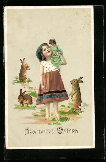 AK Osterhasen und Mädchen mit Puppe