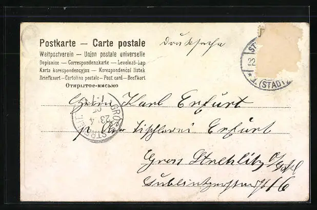 alte Ansichtskarte, gelaufen, Briefmarke entfernt, rückseitig Oberflächenschaden, guter Zustand
