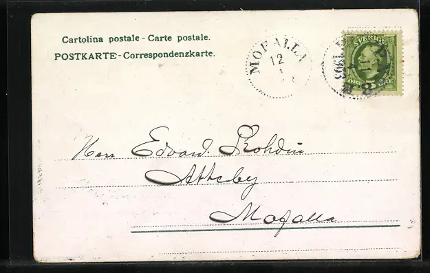 Personenbezogene Daten auf der Rückseite der Karte wurden durch blauen Textmarker unkenntlich gemacht. Die blauen Stellen sind auf die Vorderseite durchgeweicht und wirken sich negativ auf das Postkartenfoto aus