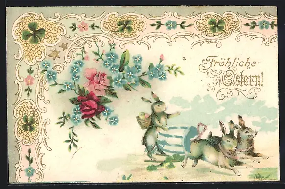 AK Osterhasen ziehen einen Osterhasen mit Eierkorb