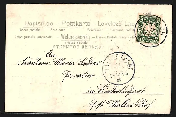 Personenbezogene Daten auf der Rückseite der Karte wurden durch blauen Textmarker unkenntlich gemacht. Die blauen Stellen sind auf die Vorderseite durchgeweicht und wirken sich negativ auf das Postkartenfoto aus