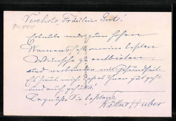 Personenbezogene Daten auf der Rückseite der Karte wurden durch blauen Textmarker unkenntlich gemacht. Die blauen Stellen sind auf die Vorderseite durchgeweicht und wirken sich negativ auf das Postkartenfoto aus