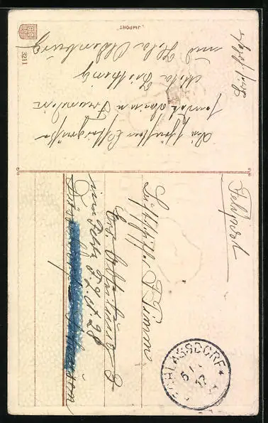 Personenbezogene Daten auf der Rückseite der Karte wurden durch blauen Textmarker unkenntlich gemacht. Die blauen Stellen sind auf die Vorderseite durchgeweicht und wirken sich negativ auf das Postkartenfoto aus