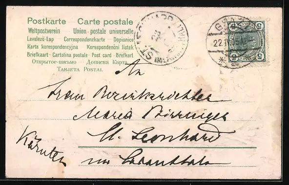 Personenbezogene Daten auf der Rückseite der Karte wurden durch blauen Textmarker unkenntlich gemacht. Die blauen Stellen sind auf die Vorderseite durchgeweicht und wirken sich negativ auf das Postkartenfoto aus