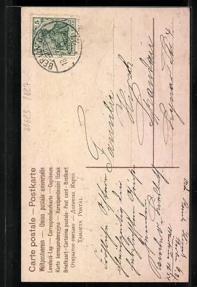 Personenbezogene Daten auf der Rückseite der Karte wurden durch blauen Textmarker unkenntlich gemacht. Die blauen Stellen sind auf die Vorderseite durchgeweicht und wirken sich negativ auf das Postkartenfoto aus