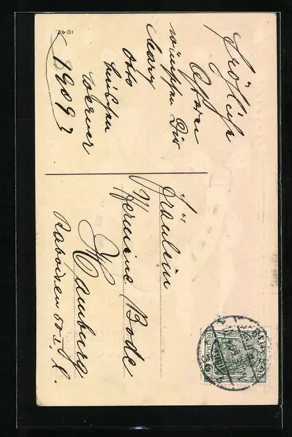 Personenbezogene Daten auf der Rückseite der Karte wurden durch blauen Textmarker unkenntlich gemacht. Die blauen Stellen sind auf die Vorderseite durchgeweicht und wirken sich negativ auf das Postkartenfoto aus