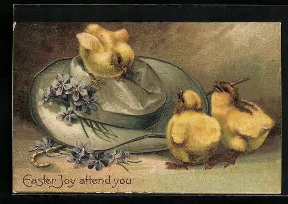 AK Osterküken auf einem Hut, Veilchen