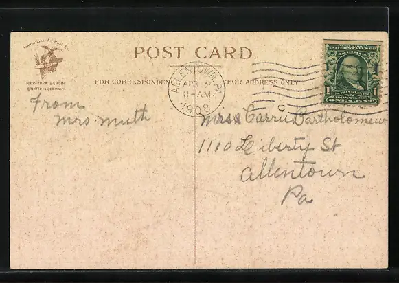 Personenbezogene Daten auf der Rückseite der Karte wurden durch blauen Textmarker unkenntlich gemacht. Die blauen Stellen sind auf die Vorderseite durchgeweicht und wirken sich negativ auf das Postkartenfoto aus
