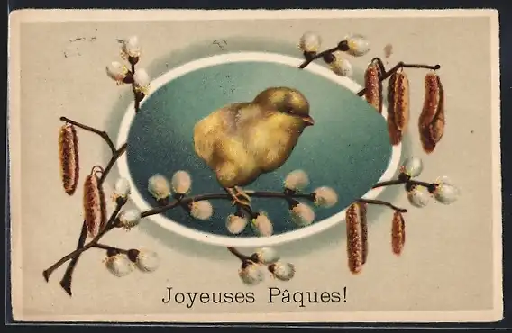 AK Osterküken auf einem Weidenzweig