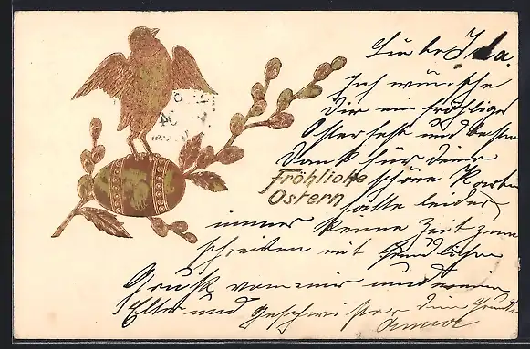 AK Osterküken auf goldenem Osterei und Weidenzweig