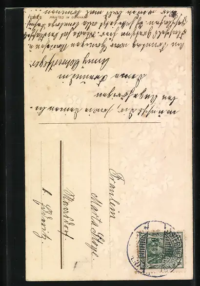 Personenbezogene Daten auf der Rückseite der Karte wurden durch blauen Textmarker unkenntlich gemacht. Die blauen Stellen sind auf die Vorderseite durchgeweicht und wirken sich negativ auf das Postkartenfoto aus