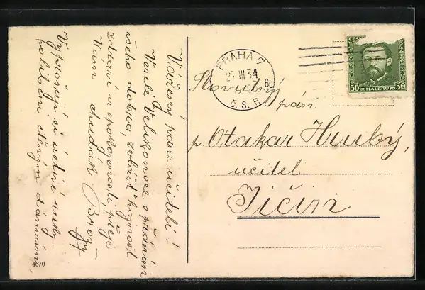 Personenbezogene Daten auf der Rückseite der Karte wurden durch blauen Textmarker unkenntlich gemacht. Die blauen Stellen sind auf die Vorderseite durchgeweicht und wirken sich negativ auf das Postkartenfoto aus