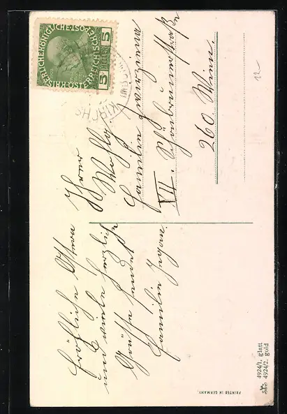 Personenbezogene Daten auf der Rückseite der Karte wurden durch blauen Textmarker unkenntlich gemacht. Die blauen Stellen sind auf die Vorderseite durchgeweicht und wirken sich negativ auf das Postkartenfoto aus