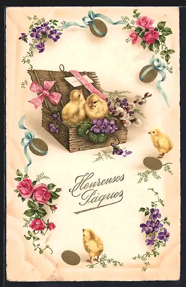 AK Osterküken in einem Korb, Kleeblätter und Veilchen