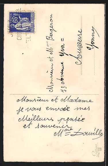 Personenbezogene Daten auf der Rückseite der Karte wurden durch blauen Textmarker unkenntlich gemacht. Die blauen Stellen sind auf die Vorderseite durchgeweicht und wirken sich negativ auf das Postkartenfoto aus