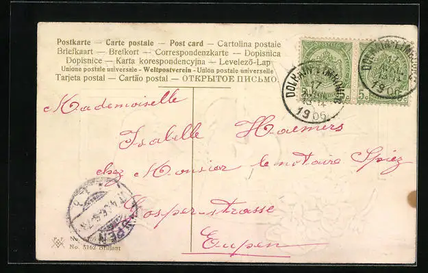 Personenbezogene Daten auf der Rückseite der Karte wurden durch blauen Textmarker unkenntlich gemacht. Die blauen Stellen sind auf die Vorderseite durchgeweicht und wirken sich negativ auf das Postkartenfoto aus