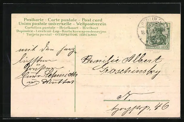 Personenbezogene Daten auf der Rückseite der Karte wurden durch blauen Textmarker unkenntlich gemacht. Die blauen Stellen sind auf die Vorderseite durchgeweicht und wirken sich negativ auf das Postkartenfoto aus