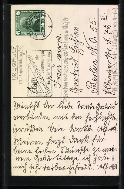 Personenbezogene Daten auf der Rückseite der Karte wurden durch blauen Textmarker unkenntlich gemacht. Die blauen Stellen sind auf die Vorderseite durchgeweicht und wirken sich negativ auf das Postkartenfoto aus