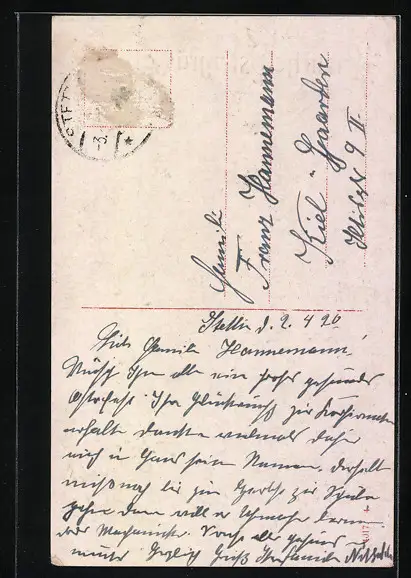 Personenbezogene Daten auf der Rückseite der Karte wurden durch blauen Textmarker unkenntlich gemacht. Die blauen Stellen sind auf die Vorderseite durchgeweicht und wirken sich negativ auf das Postkartenfoto aus