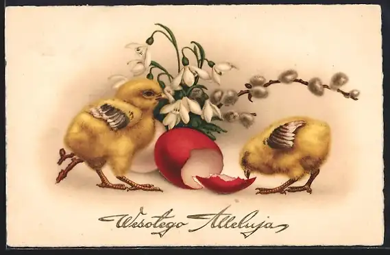 AK Osterküken mit Eierschale, Schneeglöckchen und Weidenzweig