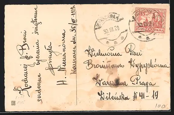 Personenbezogene Daten auf der Rückseite der Karte wurden durch blauen Textmarker unkenntlich gemacht. Die blauen Stellen sind auf die Vorderseite durchgeweicht und wirken sich negativ auf das Postkartenfoto aus