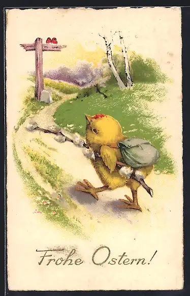 AK Osterküken mit Kätzchenzweig am Wegweiser, Ostergruss