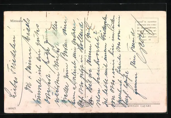 Personenbezogene Daten auf der Rückseite der Karte wurden durch blauen Textmarker unkenntlich gemacht. Die blauen Stellen sind auf die Vorderseite durchgeweicht und wirken sich negativ auf das Postkartenfoto aus