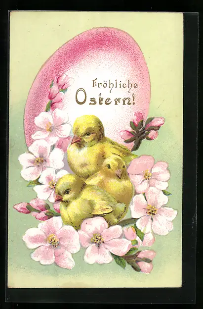 AK Osterküken mit Kirschblüten
