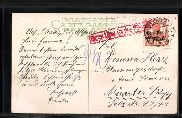 Personenbezogene Daten auf der Rückseite der Karte wurden durch blauen Textmarker unkenntlich gemacht. Die blauen Stellen sind auf die Vorderseite durchgeweicht und wirken sich negativ auf das Postkartenfoto aus