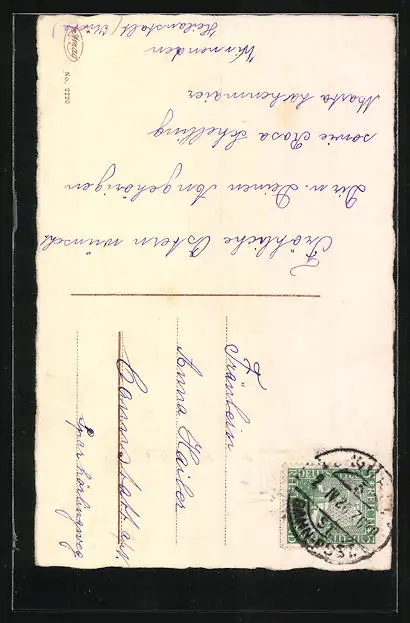 Personenbezogene Daten auf der Rückseite der Karte wurden durch blauen Textmarker unkenntlich gemacht. Die blauen Stellen sind auf die Vorderseite durchgeweicht und wirken sich negativ auf das Postkartenfoto aus